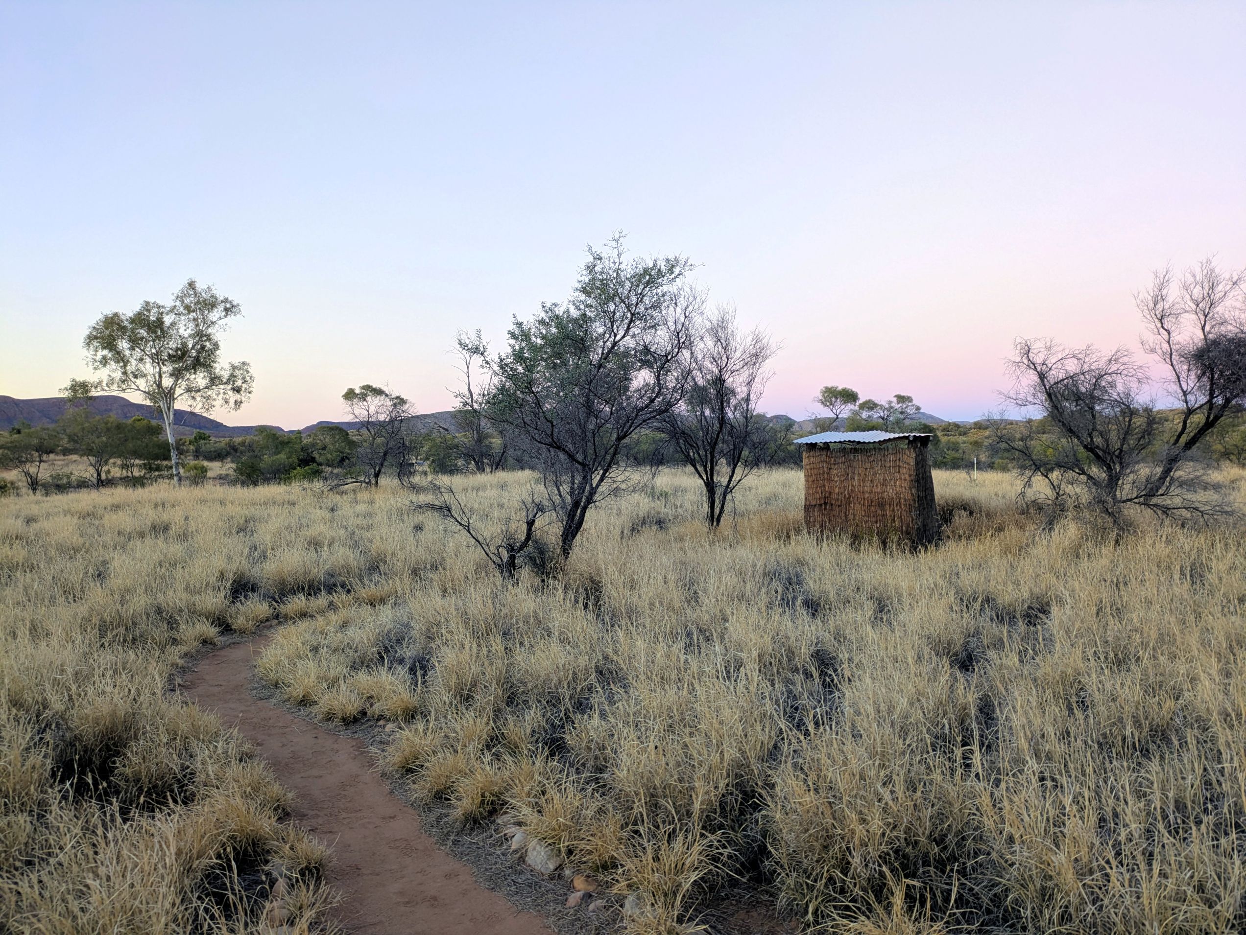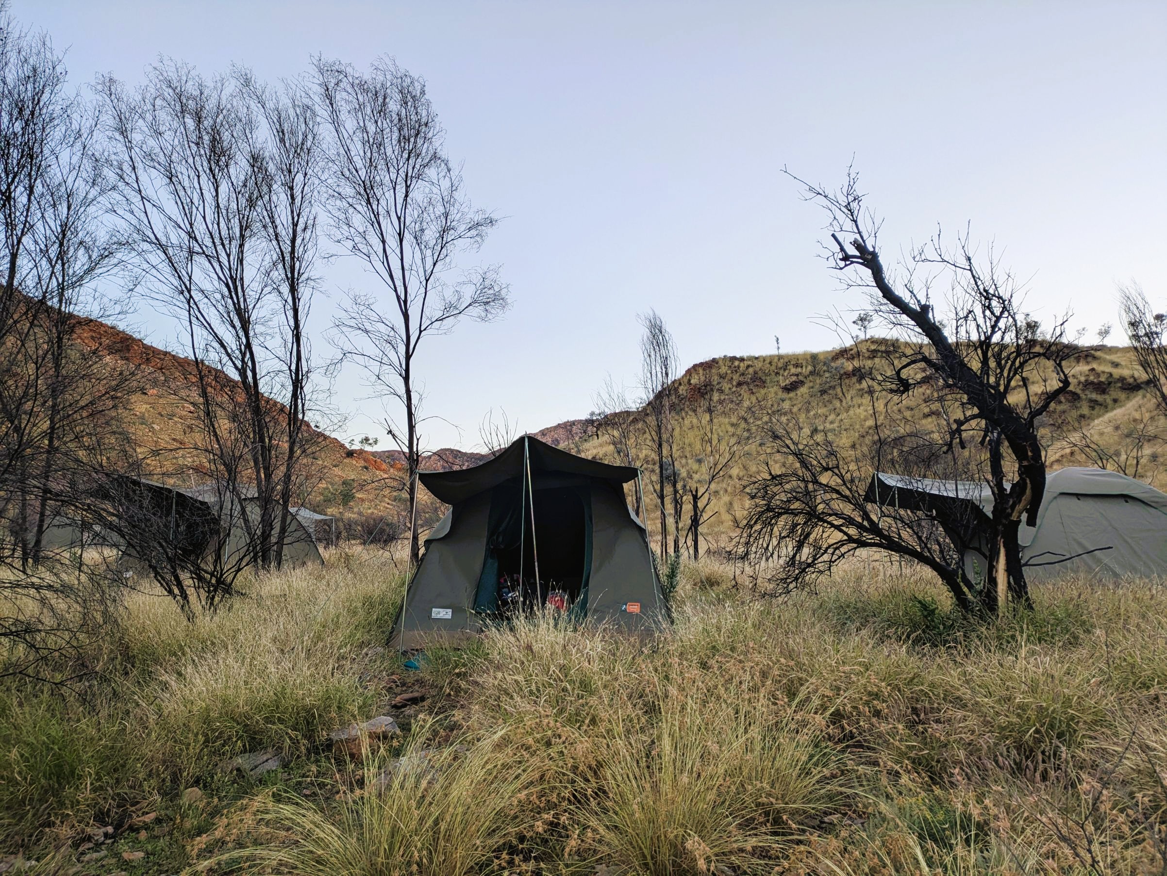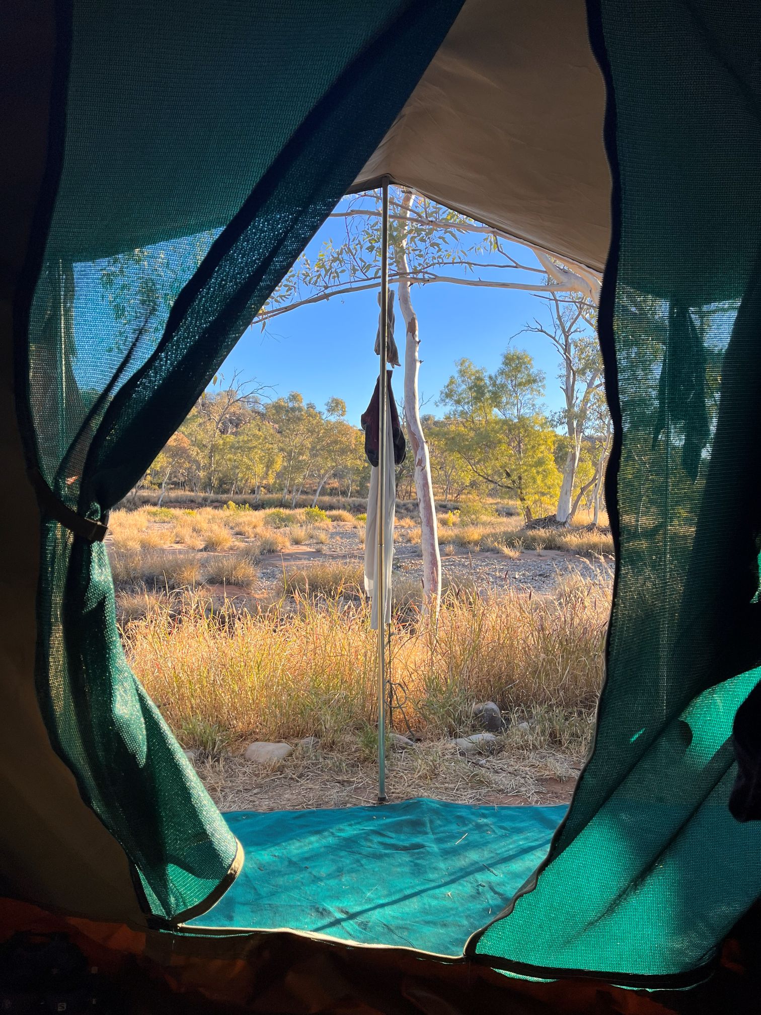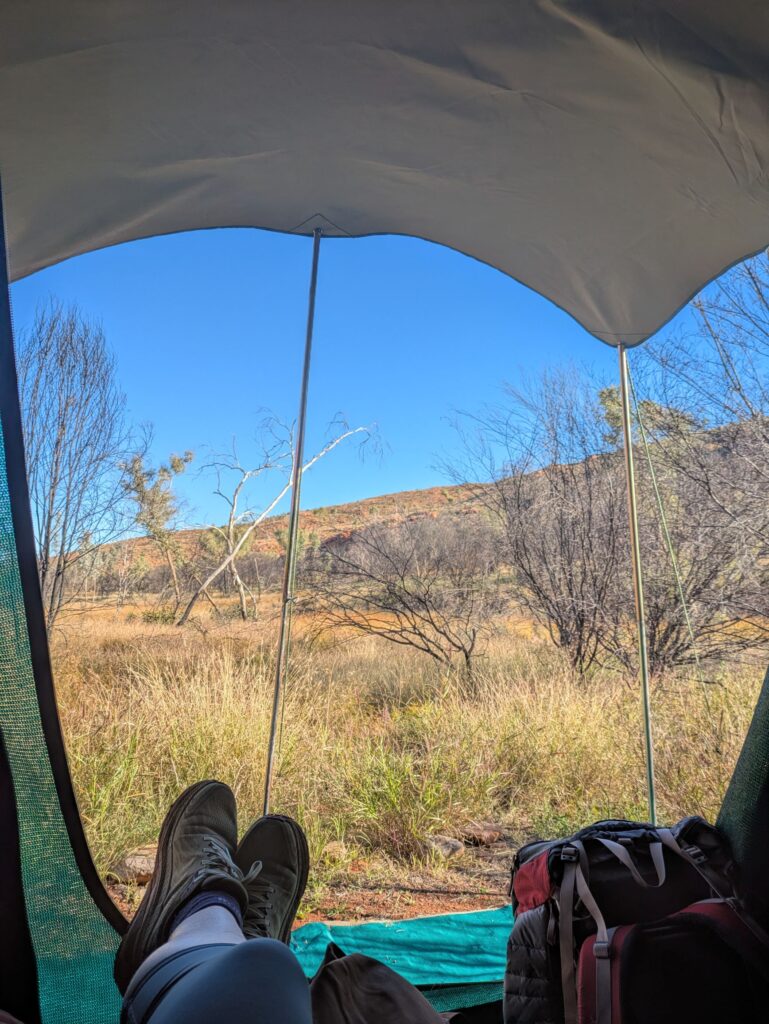 We stayed at Camp 1 near Standley Chasm for 2 nights and 6 nights at Camp 2 near Ormiston Gorge. We had a tent each which was tall enough for me to stand up in and housed a stretcher bed with a swag on it, a bedside table and a camp stool. We were encouraged to wee in the bush and keep our poos for the eco loos (better than a compost toilet), which were built away from the camp kitchen and tents with great views from the throne. A solar powered hot water tank meant we could fill up a big bowl with hot water and have a fancy bird bath in the strategically placed outdoor showers, where the showerer had ultimate privacy but with all their bits open to the elements (so good).