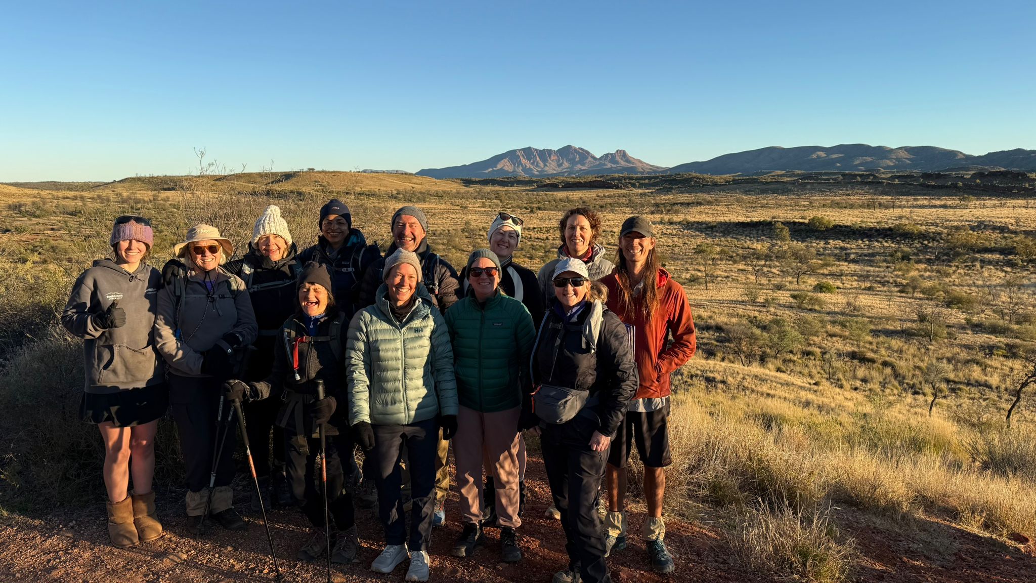 Across the 9 days we walked 117kms of the total 221kms of the Larapinta Trail, which runs from Alice Springs to Mount Sonder. The trail is made up of 12 sections, with our 9 day adventure consisting of a patchwork of sections rather than a long connected path, designed around which sections of the trail were most accessible. Interestingly, each day was very different – vistas, terrain, fauna, flora, ascents and descents, chasms, waterholes and weather. The guides took it in turn walking with us with one staying back at camp during the day to clean and cook.