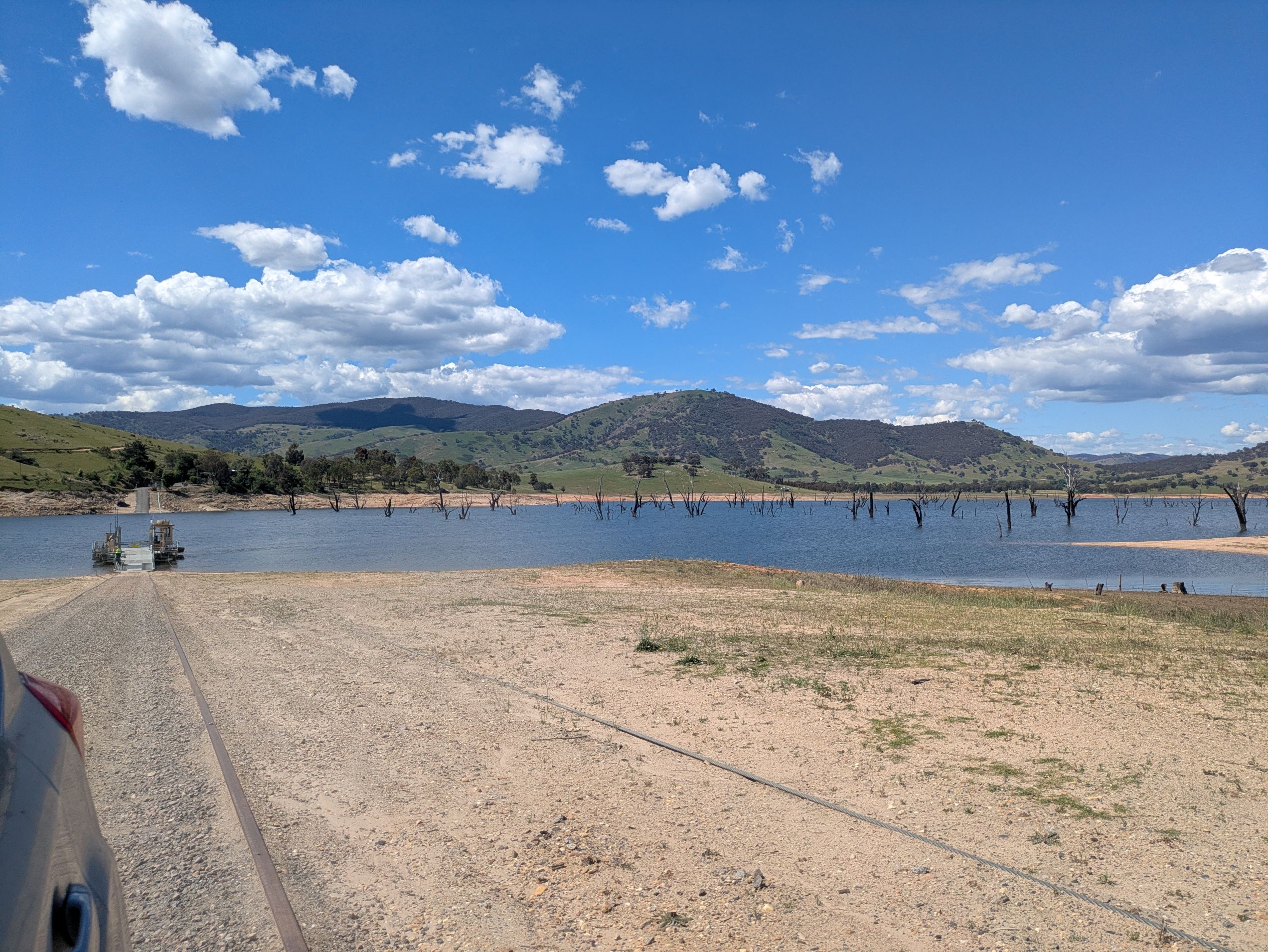 Em and I wanted to see a little bit of the countryside without adding too much to our journey, so decided to detour via the Wymah Ferry – a heritage listed cable ferry (max 3 vehicles) that crosses the Murray River to the east of Lake Hume. Apparently the Wymah Ferry has been operating in various forms since the 1860s and was originally established by a publican to bring patrons across the river to his pub. Today’s ‘The Spirit of Wymah’ was installed in 2013, is managed by the NSW Government, is free to ride and is open across the year (check the website for hours). The view of drowned trees poking out of the river, dead as a result of artificial damming, is always a bit hard for my head to process and doesn’t quite fit with the landscape. But we enjoyed the ferry experience all the same.