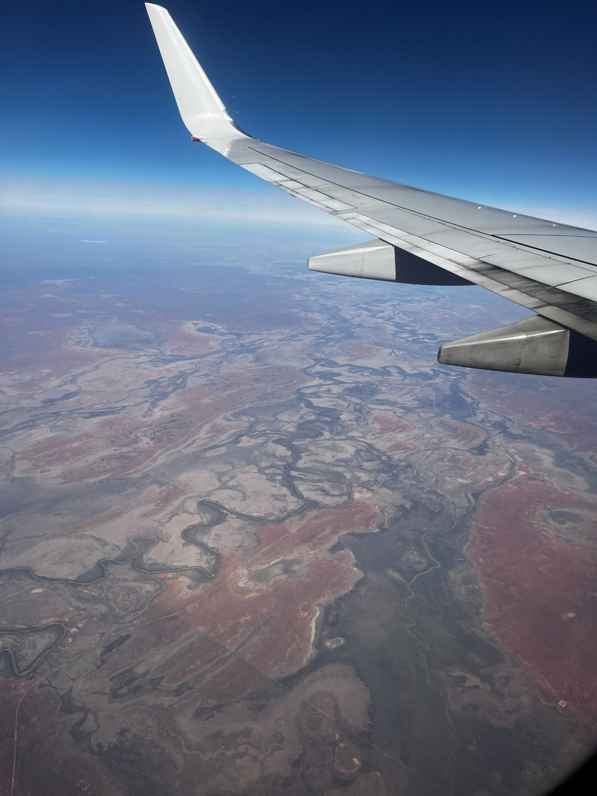 Flying from Sydney to Alice Springs, Emma and I were treated to a view of Lake Eyre filling with water. Em had the window seat so took a photo a minute to make sure we didn’t miss anything. I was sitting next to a man who spent the whole flight coughing and wiping his runny nose on his clothes – it was a good thing Em and I had facemasks to wear. Out the window the colours of the landscape were stunning and the lines of the landscape were mesmerising. As we got closer to Alice the desert changed as the green crept back into the picture.