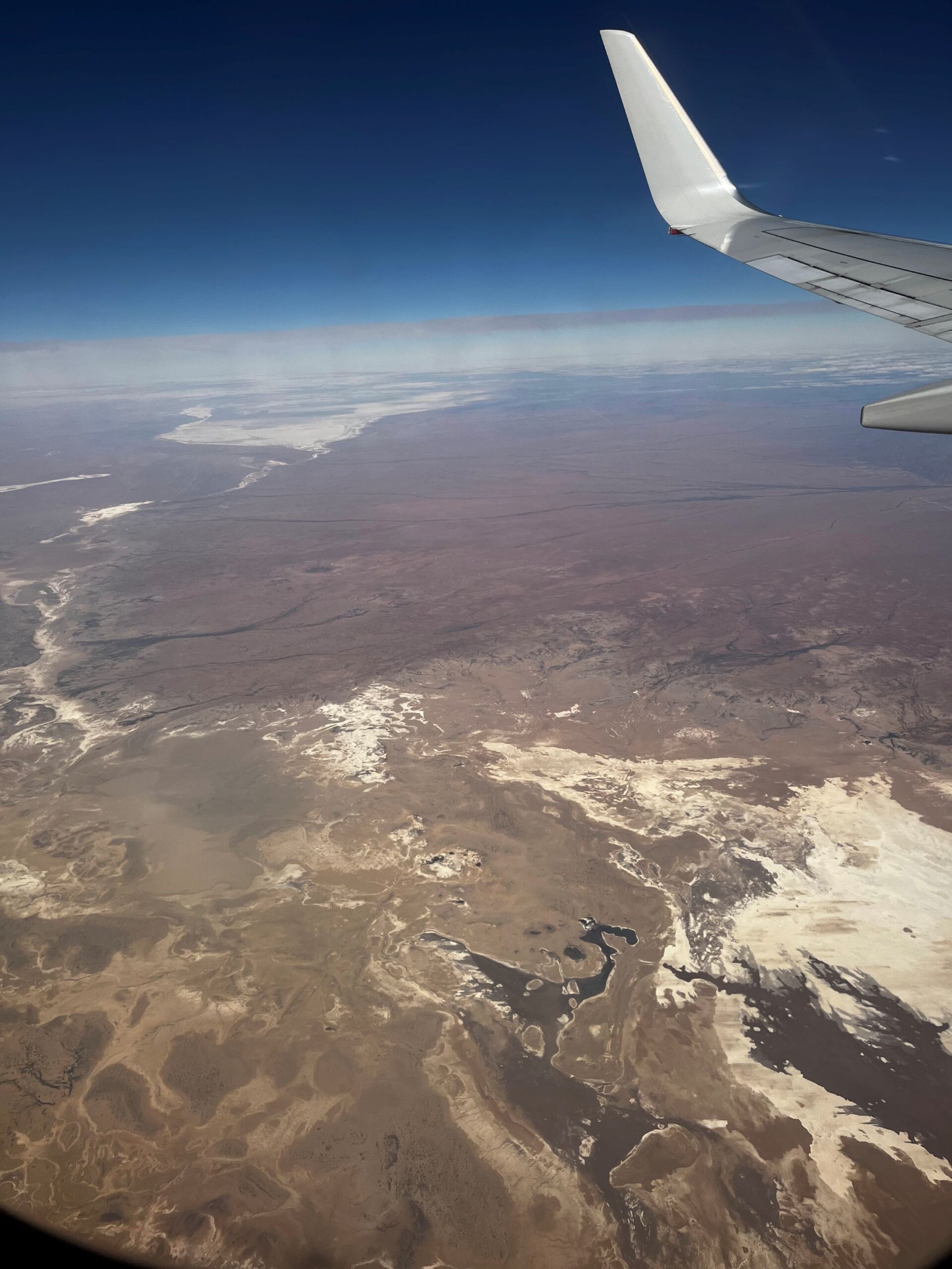 A view out of a plane window over lake tributaries with evidence of salt white patches
