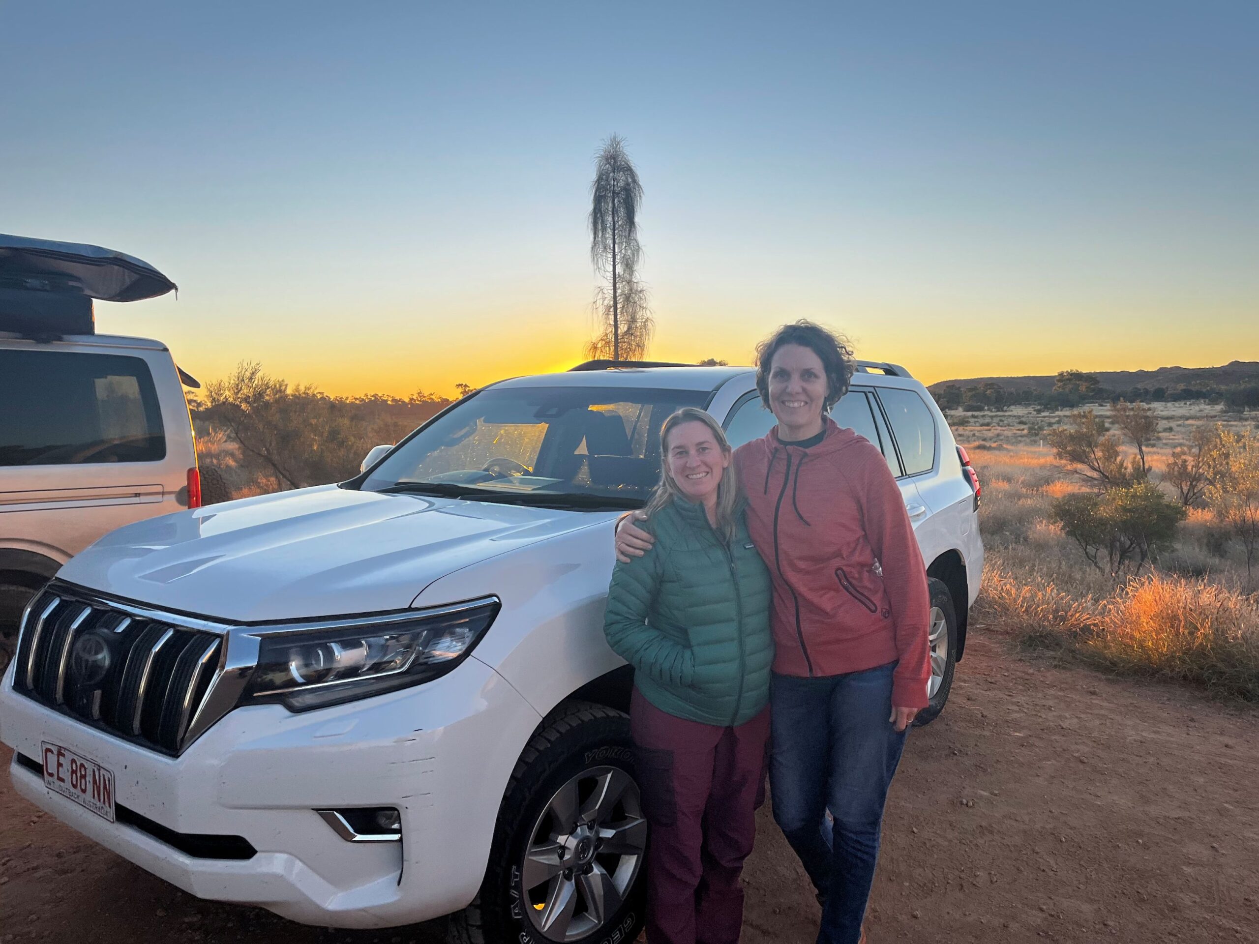 Two women at the base of Uluru - one hugging a tree and one hugging a rock