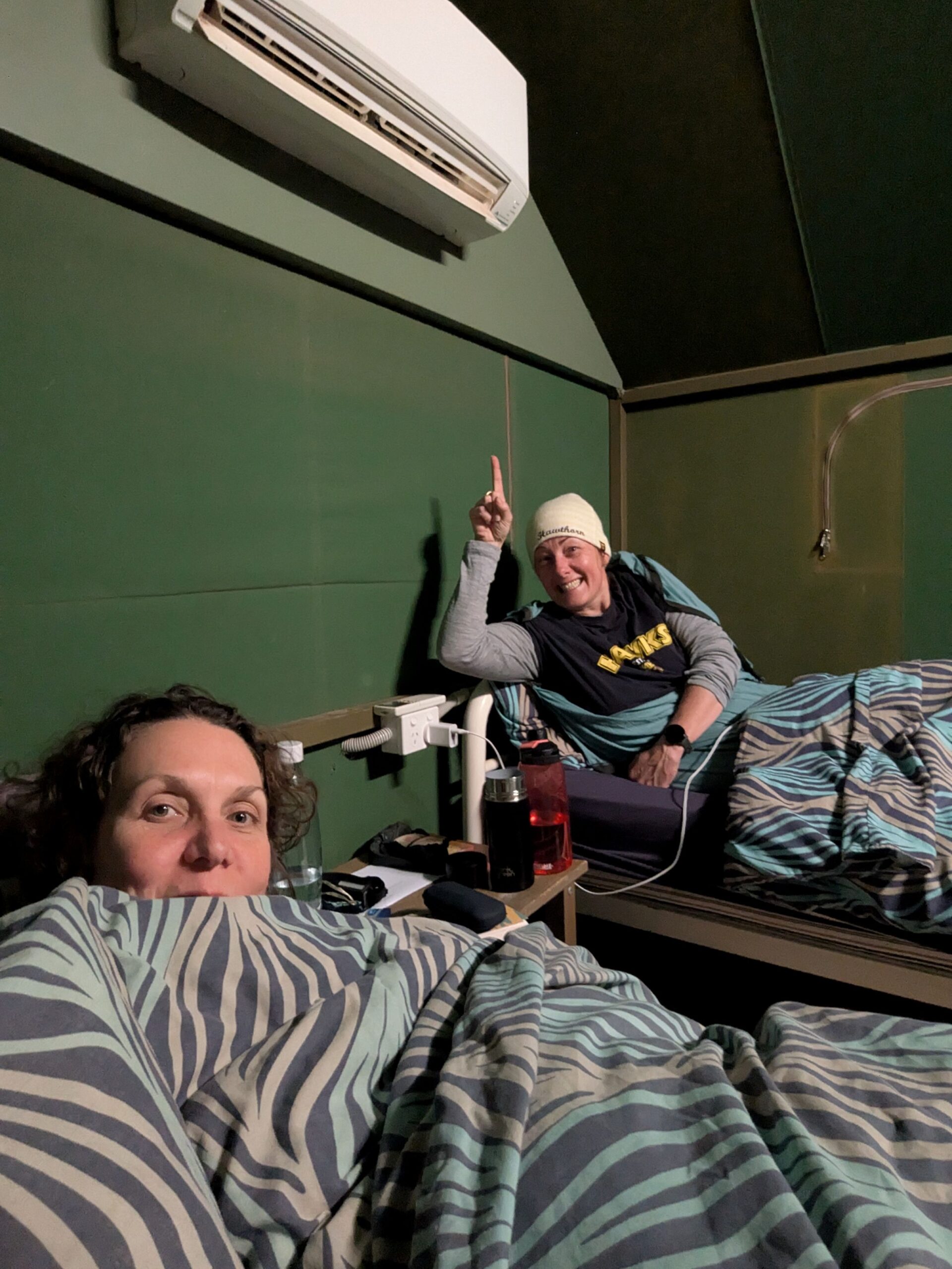 Two women in single beds in a tent, pointing to the air conditioner attached above them